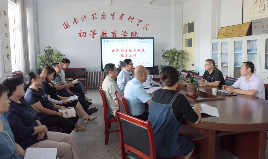 9月7日下午,党委书记余学军在学校办公室负责人的陪同下,深入初等教育学院调研指导工作。学院领导班子成员及部分教职工参加了会议,会议由院长张永明主持。