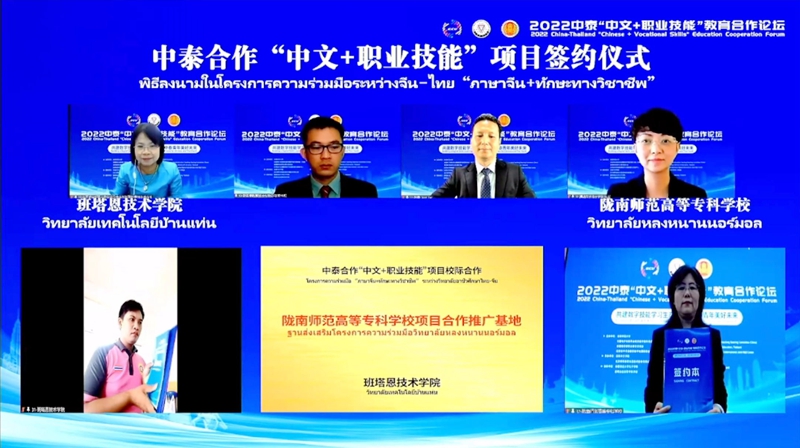 由云南师范大学、全国电子商务职业教育教学指导委员会、泰国教育部职业教育委员会和云南省中老泰教育数字化国际联合研发中心联合主办的2022中泰“中文+职业技能”教育合作论坛在线上举办。beat365被授予中泰合作“中文+职业教育”项目示范校称号,校长李艳红代表学校授牌,并与泰国班塔恩技术学院签订了中泰“中文+职业教育”国际合作项目协议书。