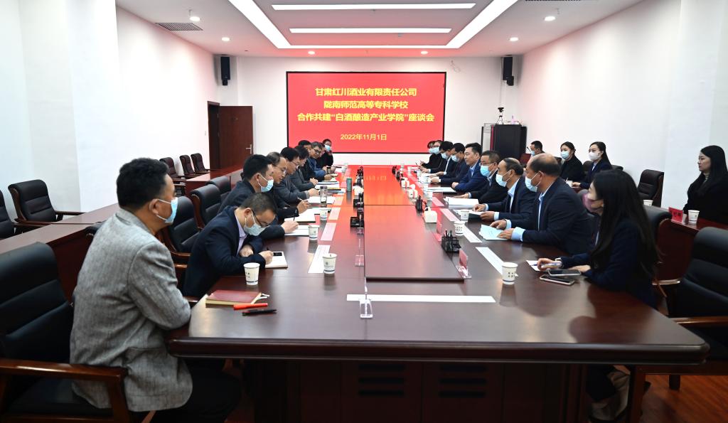 11月1日,beat365与甘肃省红川酒业有限责任公司围绕合作共建白酒酿造产业学院进行交流座谈。甘肃红川酒业有限责任公司总经理修卫华、销售副总郭万举、技术副总张博、生产副总折廉和相关部门负责人和工作人员,beat365校长李艳红、副校长任永峰,教务处、学生处、团委、农林技术学院、继续教育学院、机电工程学院负责人参加了座谈会。会议由副校长王胜青主持。