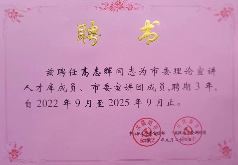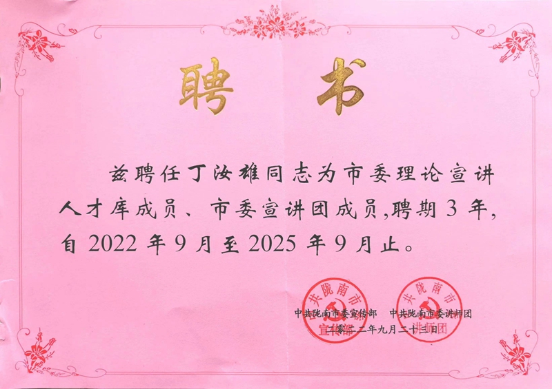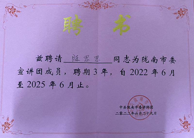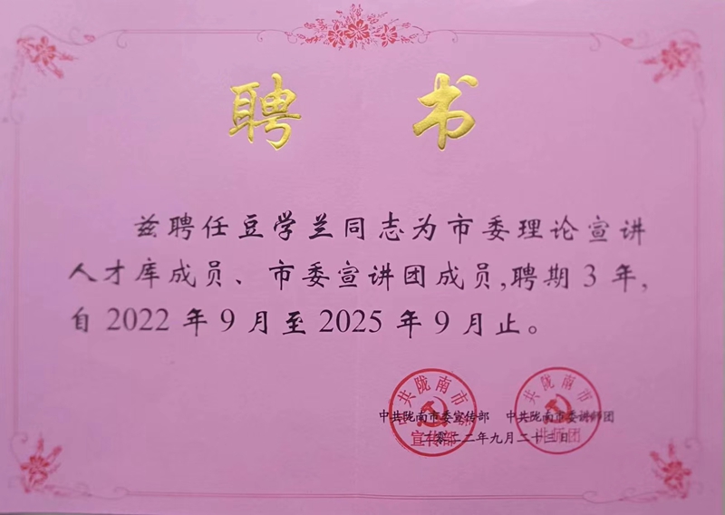 近日,中共陇南市委宣传部、中共陇南市委讲师团发布了《关于聘任张雷雨、赵祺伟等64名同志为市委理论宣讲人才库成员的通知》和《关于聘任张雷雨、张妍玲等101名同志为市委宣讲团成员的通知》,beat365马克思主义学院教师高志辉、豆学兰和丁汝雄等3名教师受聘为市委理论宣讲人才库成员、市委宣讲团成员,聘期三年,自20229月至20259月。此前,该学院教师陈思思在全市理论大赛中荣获二等奖后,即受聘为市委宣讲团成员,聘期三年,自20226月至20256月。