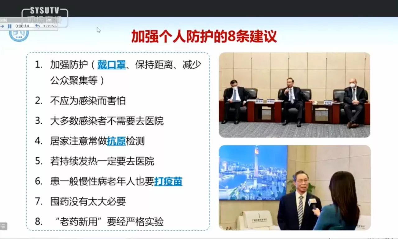 在讲堂上,钟南山院士总结了两年来抗疫取得的成就,系统分析全国范围第二波(Omicron)疫情的特点,介绍其Omicron的生物学特征、致病性以及在大学教学环境中如何让学生加强个人防护。他提出了8条个人防护建议,即加强防护(戴口罩、保持距离、减少公众聚集等);不应为感染而害怕;大多数感染者不需要去医院;居家注意常做抗原检测;若持续发热一定要去医院;患一般慢性病老年人也要打疫苗;囤药没有太大必要;“老药新用”要经严格实验。
