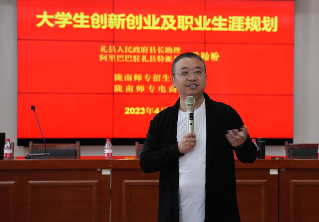 4月10日下午,学校在电商学院三楼多功能厅举行大学生就业与创业指导报告会。此次报告会由阿里巴巴公益基金会驻礼县特派员、礼县人民政府县长助理尹贻盼主讲。学校纪委书记、监察专员镡旭东出席报告会,电子商务学院院长何炜主持报告会。全校各二级学院就业工作领导小组成员、招生就业处相关工作人员以及电子商务学院部分师生共230余人参加了报告会。