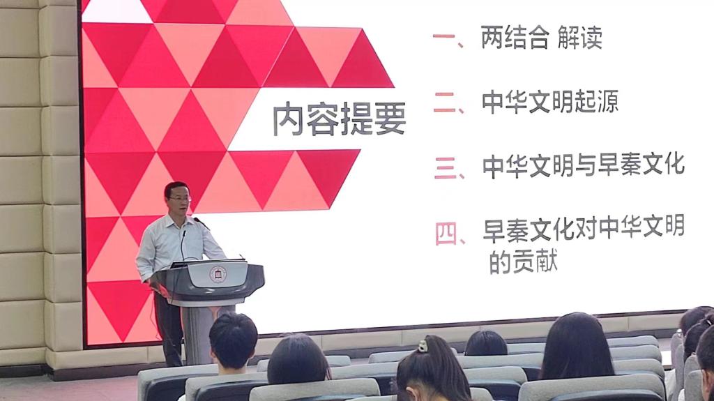 启动仪式结束后,蒲向明教授作了题为“中华文明探源与早期秦文化”的专题报告,分别从“两结合”、中华文明起源、中华文明与早秦文化及早秦文化对中华文明起源中华文明的贡献等方面进行了深入剖析。他指出,秦文化源远流长、博大精深,在中华优秀传统文化中具有重要位置,是中华文明探源的重要组成部分。他勉励青年学生要扎实深入学习二十大精神,要把马克思主义思想精髓同中华优秀传统文化精华融通起来、同人民群众日用而不觉的共同价值观念融通起来,不断赋予科学理论鲜明的中国特色。