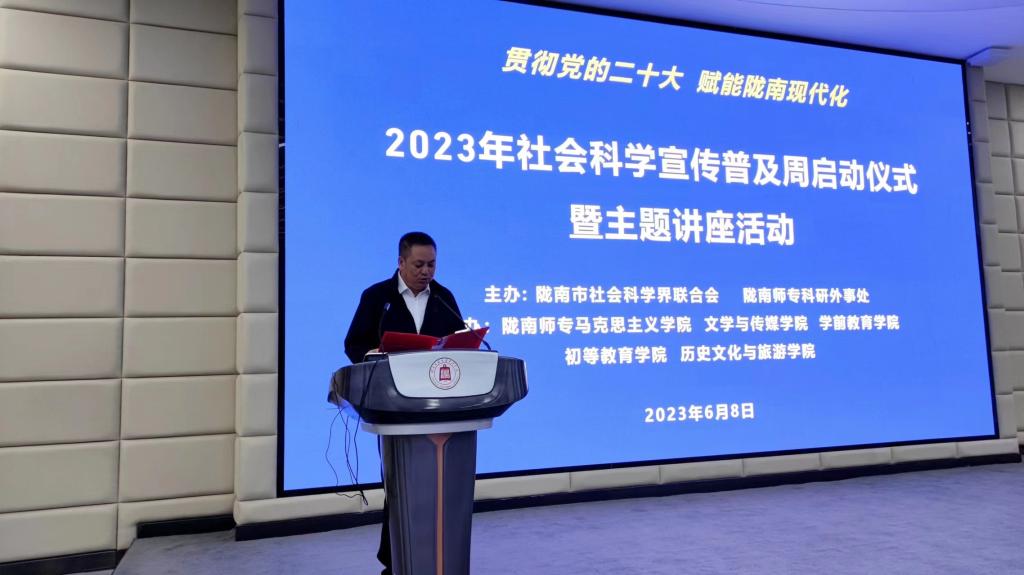 启动仪式上,杜永鹏代表陇南市社科联作了简要讲话。他指出,近年来,陇南师专在社科普及基地建设方面取得了较好的成绩,社会科学普及工作成效显著。社会科学普及基地是推动社科理论工作贴近实际、贴近生活和贴近群众,推进马克思主义大众化的重要平台,是开展经常性、公益性、群众性社会科学普及活动的重要载体和有力抓手,是满足人民群众精神文化需要、促进社科普及工作常态化的实践探索。陇南师专自2017年创建社科普及基地以来,紧紧围绕学校党委、校委会中心工作,整合自身资源优势,搭建特色平台载体,开展了主题突出、内容丰富、形式多样的社科普及活动,不断扩大社科普及工作覆盖面,为全校社科普及工作守正创新,提质增效,加快高等教育高质量发展,推动陇南哲学社会科学事业发展繁荣做出了积极贡献。他希望陇南师专的社科理论工作者和广大教师,心怀国之大者,牢记责之重者,以服务高质量发展为己任,踔厉奋发、勇毅前行,为陇南的经济社会发展做出积极贡献。