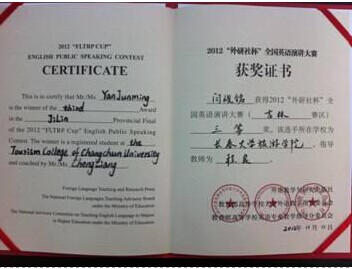 2012“外研社杯”全国英语演讲大赛于11月11日在东北师范大学人文学院举行,77名选手参赛,55名获奖。经过激烈的角逐,独立学院组评出一等奖一名、二等奖三名、三等奖六名。其中,金沙官网旅游分院11级学生闫峻铭荣获独立学院组三等奖第二名,指导教师为大学外语教研室程良老师。