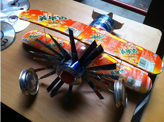 在同学们的努力下种类多样、生动有趣的作品逐步成形,并被陆续投放到活动区域中。这个飞机模型就是用废旧的易拉罐为主要材料制作的,可见学生们利用易拉罐制作的飞机也有真飞机的“风采”。