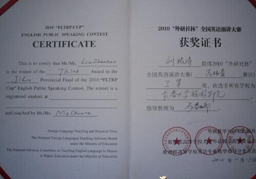 旅游管理分院09级刘振涛同学在2010“外研社杯”全国英语演讲大赛(吉林省赛区)中荣获三等奖。
