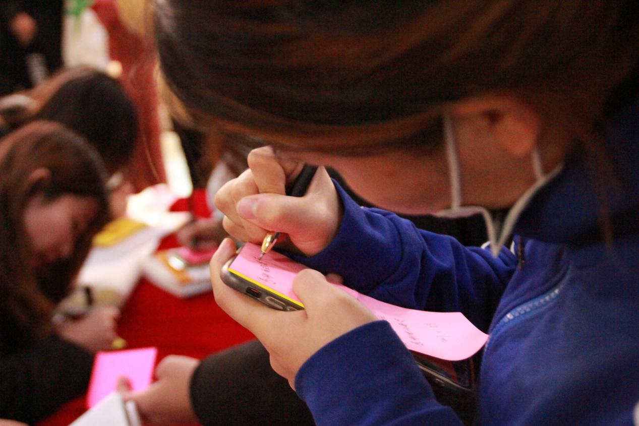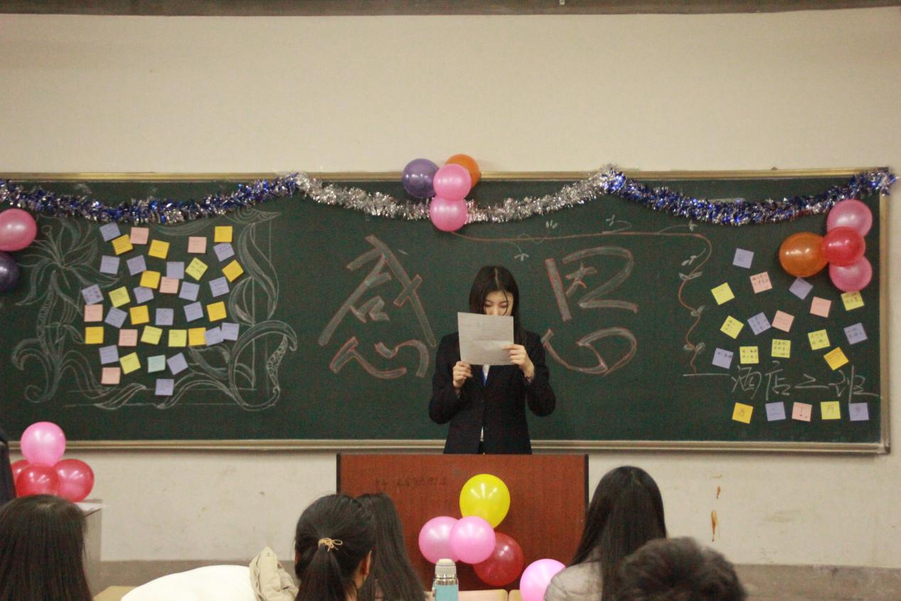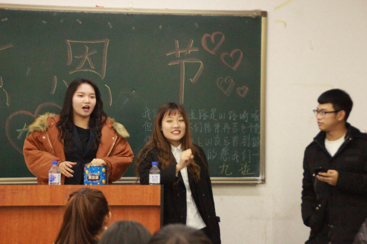 同学们在感恩墙前的留言 晚上18时,学生会的各位主席团和部长们也走进班级,和旅游管理学院17级全体同学一起度过了一个充满意义的感恩节夜晚。学生会组织各班开展了以感恩节为主题的班会活动。在学生会部长们的引导下,同学们说出了一些想说又说不出的话,并对自己的父母和老师们说出了自己的心里话。为了活跃班级气氛,学生会还特意准备一些小游戏,让大家一起愉快的度过这个有意义的夜晚。