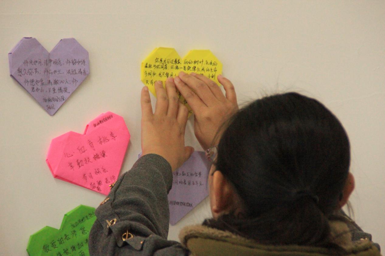 学生会部长们为老师们送上祝福 早上8点,旅游管理学院学生会也通过手制贺卡将祝福送给了老师们。同时,也安排了学生会的部员给全体旅游管理学院的老师们送上了温馨的祝福——学生会成员们一早便在二楼所有教室门口,手持心形贺卡静候老师们的到来。