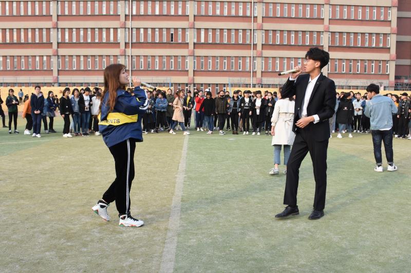 随着下课铃响起,学生们陆续走出教室,走向足球场。当音乐响起时,足球场的学生循声而来,此时,早已在人群中准备好的歌手忽然唱起了《奔跑》,立刻引起了学生们的热烈欢呼。随后,身着西装、酷劲十足的“快闪男孩”从人群中走出,随着活力十足的音乐舞动起来。紧接着一群青春洋溢的“快闪女孩”走出人群,一同献上了《开车舞》,使现场的氛围到达高潮 。