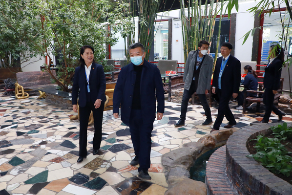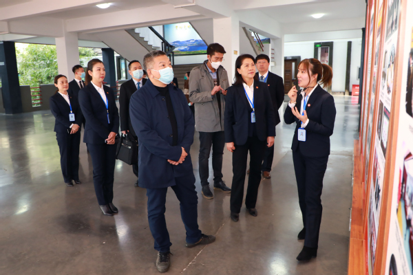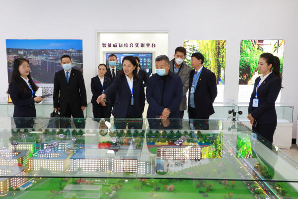 赵红石一行参观了学校独具特色的天井景观带、旅游文化学院VR虚拟实训室、人工智能实训室及学校办学成果展,系统了解了学校近年来各项事业发展情况和办学特色。