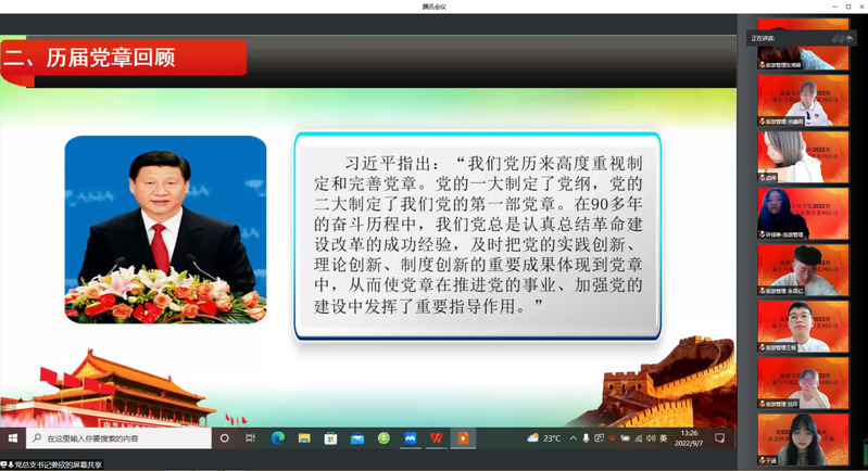 姜欣从党员、党的组织制度、党的中央组织、党的地方组织等方面向新生介绍党章内容并进行详细的分析。他强调《中国共产党章程》经历了一个不断完善的过程,体现了我们党坚持实事求是、与时俱进的原则;总纲部分系统总结了我们党在各个时期的路线、方针、政策,我们当前的学习任务意义重大,要学深学透、理解和认同党章,严格按照党章的规定办事,是大家在思想上和行动上向党组织靠拢,保持先进性的前提条件和根本保证。