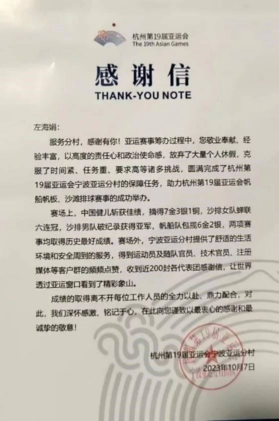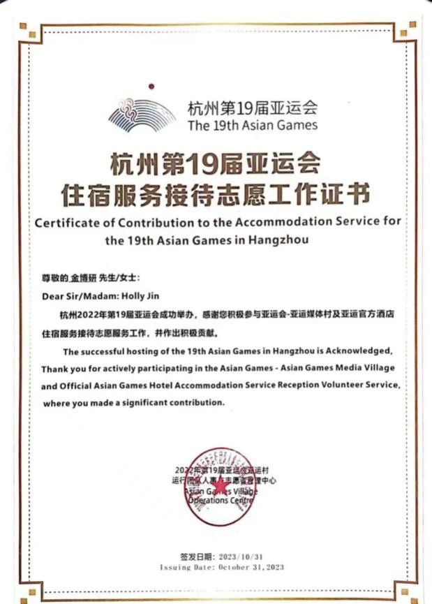 历时5个月的志愿服务期间,学校志愿者以细致入微的服务,传递无数温情瞬间,得到了亚运会官方制定酒店运营团队、酒店方和客人的一致认可,获得了杭州第19届亚运会服务保障工作特别贡献奖、杭州第19届亚运会主官方接待酒店卓越合作伙伴奖等。