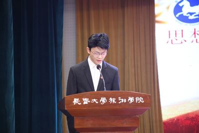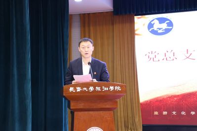 旅游文化学院党总支书记凤龙致辞。他对团学组织学生骨干们的勤勉努力与无私奉献给予了充分肯定和高度赞扬,同时,也对新一届团学干事们提出了希望,一是希望团学干事要学会主动思考、积极探索,不断改进工作方法,提高工作效率;二是希望团学干事要树立团队意识,在实际工作中,相互支持、相互配合,心往一处想、劲往一处使,形成强大的工作合力;三是希望团学干事要保持初生牛犊不怕虎、越是艰险越向前的刚健勇毅,勇立时代潮头,争做时代先锋。