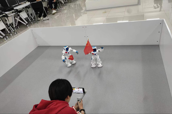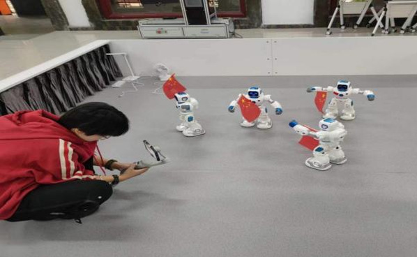在活动中,21级物联网工程专业李增辉、徐国庆等小组成员积极参与机器人的调试工作。他们通过不断优化程序,调整动作和声音,为机器人赋予更加智能和动感的表演能力。通过物联网技术的应用,这些AI机器人可以实现自主动作,用它精巧的机械臂摆出各种具有创意的姿势,如模仿挥舞国旗和做各种经典的国庆庆祝动作。同时,机器人还可以通过语音技术与人进行交互,引起了大家的兴趣,为录制活动增添了一份神秘感。