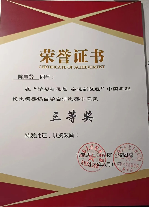 作为一名共青团员,她深感荣幸并时刻铭记自己的责任与使命。过去岁月里,她始终以先进思想武装自身,积极投身团组织活动,力求全方位进步。思想上,她坚定理想信念,拥护党的领导,积极学习马克思列宁主义等科学理论,主动关注时事政治,在提升思想政治素养的同时培育高尚品德。在2023年“学习新思想,奋进新征程” 近现代史纲要课自学自讲比赛中荣获 “三等奖”,以实际行动展现了用理论武装头脑、以实践深化认知的青年担当。