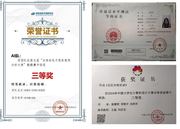 在学科竞赛的舞台上,她以扎实的专业功底和卓越的团队领导力屡创佳绩。作为团队核心成员,2023年11月,她带领团队荣获第五届吉林省电子商务案例分析大赛校级三等奖;2024年5月,在中国大学生计算机设计大赛中摘得省级三等奖;2024年7月,省级一项大创项目成功结业。系列成果充分展现了她将理论转化为实践的综合能力,以及在跨学科竞赛中的突出表现。