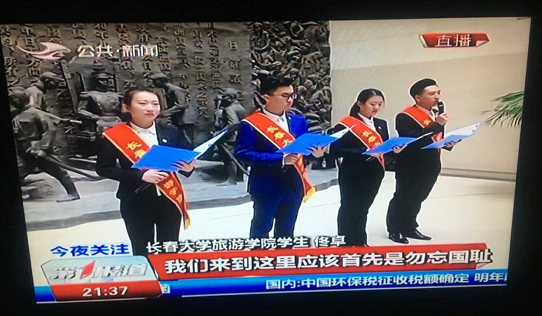 活动伊始,主持人向参加活动的同学们讲述中国抗日的历史并简单介绍了伪满皇宫博物院的历史背景。我院40名志愿者为30万死难同胞默哀,并进行宣誓:“我们铭记,血雨腥风,民族屈辱;我们奋斗,励志复兴,敢于担当;我们承诺,发奋图强,圆梦中华”!