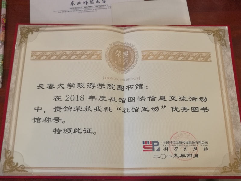 会议最后进行了科学出版社“社馆共建”优秀图书馆奖项的颁奖,我馆获得“2018年度科学出版社‘社馆共建’优秀图书馆”称号荣誉证书。
