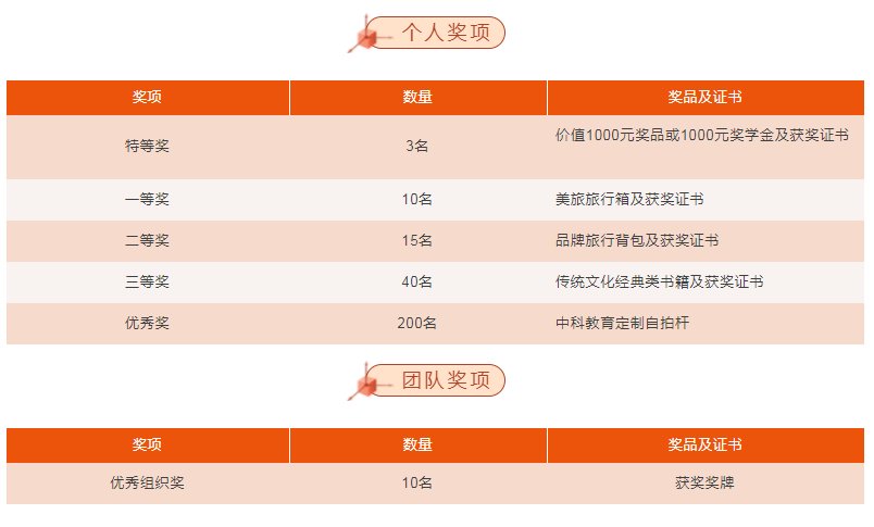 为鼓励广大读者积极参与本次诗词竞赛活动,中科教育将为获奖者颁发如下奖项: