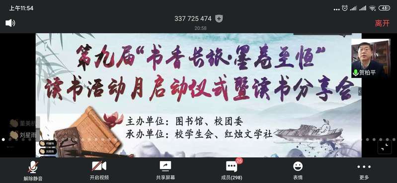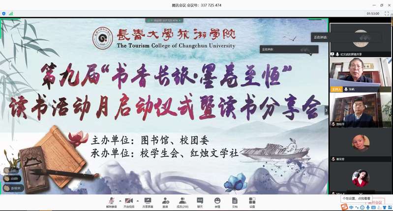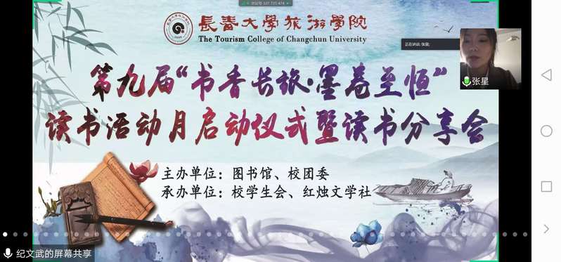 又是一年人间四月读书天,书香与花香再次一起斗艳争芳。4月23日“书香长旅·墨卷至恒”第九届读书活动月启动仪式暨读书分享会通过腾讯会议举行,打造了长旅首个“线上”读书月活动,党委副书记、副校长马维东、副校长贺柏平、团委书记贾烊、图书馆馆长秦亚欧、副馆长张星、各学院团委书记以及校团委和图书馆全体工作人员参加启动仪式。启动仪式由校团委副书记张帆主持。