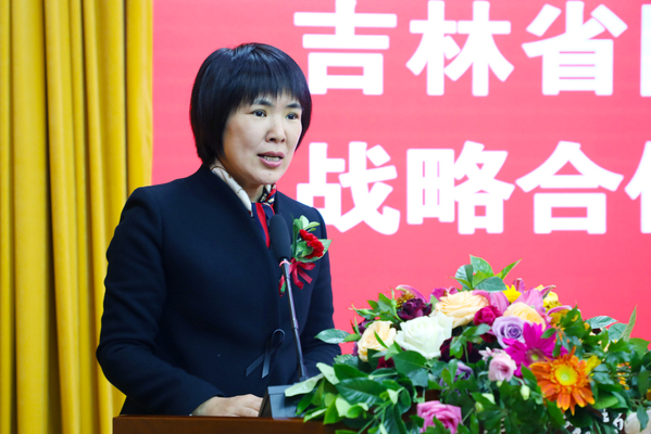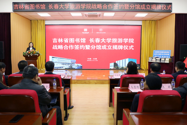 赵瑞军代表吉林省图书馆致辞,他对战略合作和分馆建设提出殷切希望和勉励,第一,有效整合和利用公共文化服务资源,发挥各自优势,共同推动民办高校学科专业建设、校园文化建设和图书馆事业发展。第二,搭建“馆校合作、共建发展”的合作平台,共同推动高校图书馆事业发展,助力建设国内一流的民办高校。第三,定期对分馆发展建设进行指导,帮助完善和达到高校图书馆标准。第四,省图书馆将提供纸质图书作为分馆图书资源流通,对学校师生开放部分馆内数字资源。