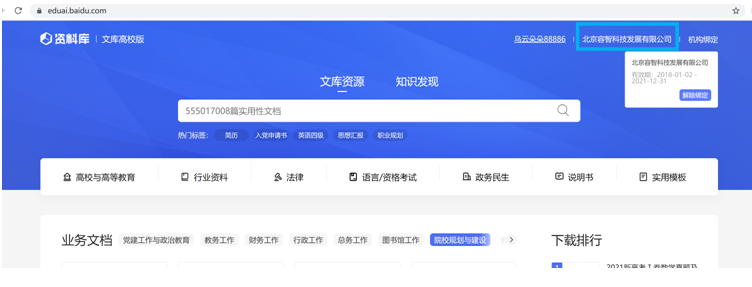 百度文库是全球最大的中文文档分享平台,“百度文库高校版”( https://eduai.baidu.com)是百度文库2017年为高校机构用户打造的数字资源服务平台。2021年新版文库高校版针对师生的日常学习及工作习惯,将5亿多的文档资源进行归类整理,搭建业务文档、课程学习、考试资料等多版块,此外还根据专业需求,划分了高校与高等教育、行业资料等多个专业领域,以帮助读者更方便有效获取所需资源。