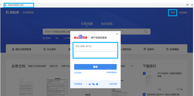 1、在校IP内,在百度文库高校版https://eduai.baidu.com,点击右上角“登录”,登录百度个人账号(或者手机号短信码登陆)