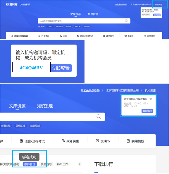2、选择右上角“机构绑定”,输入本校邀请码4G6Q46BV,完成身份绑定。只要能够绑定成功一次,即表示绑定已经完成。页面会显示“绑定成功”字样。如果转校或者毕业,不再需要百度文库高校版的服务,可以点击“解除绑定”。