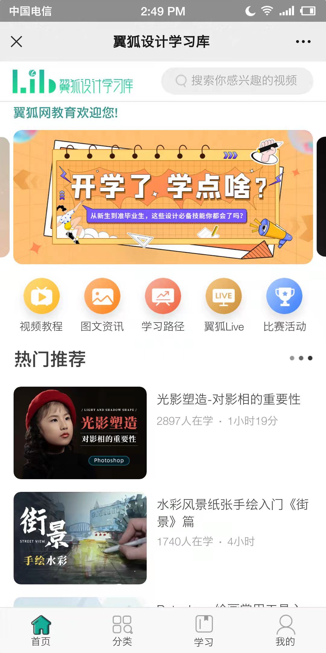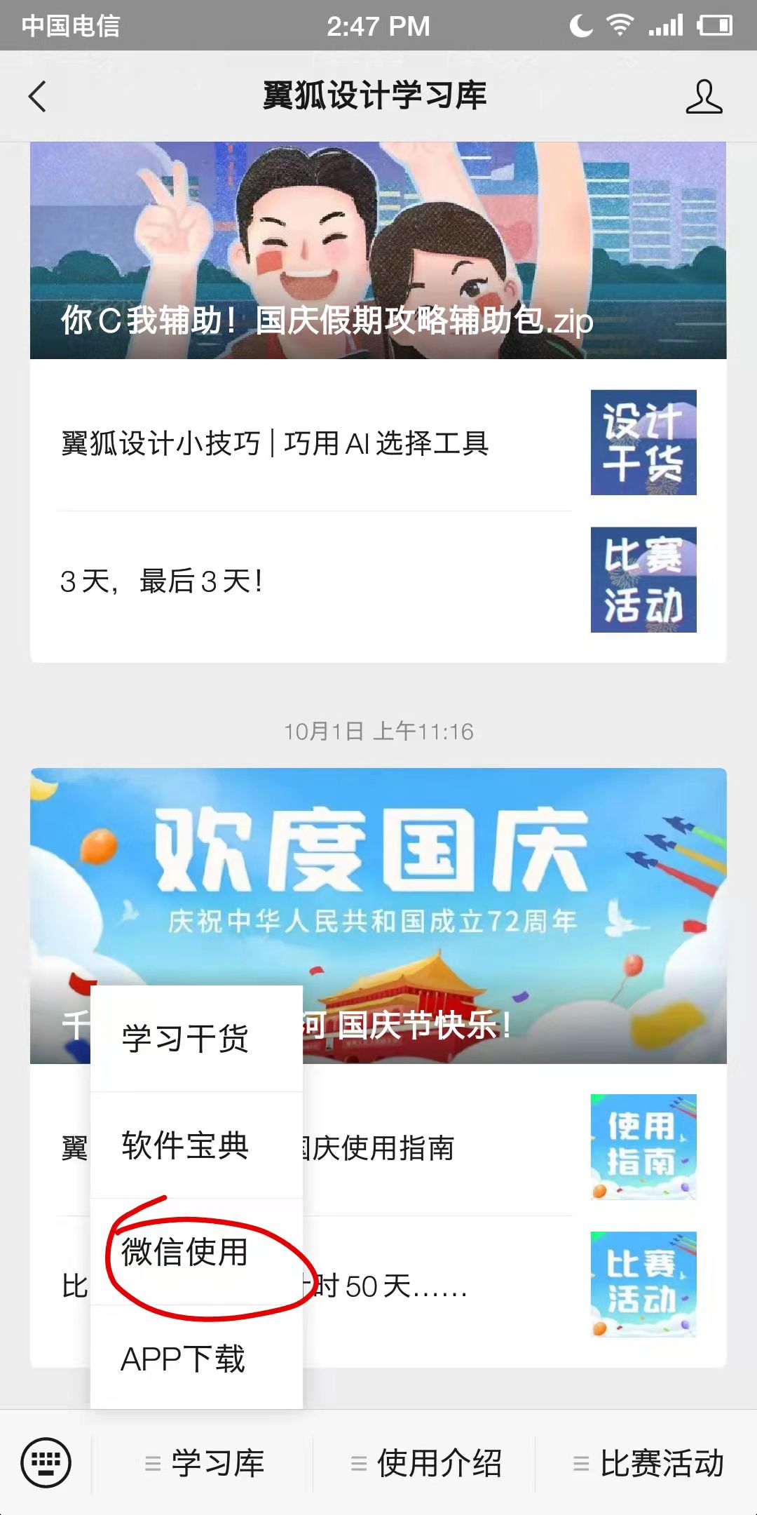 点击左下角“学习库”-“微信使用”即可进入翼狐设计学习库微信端学习。