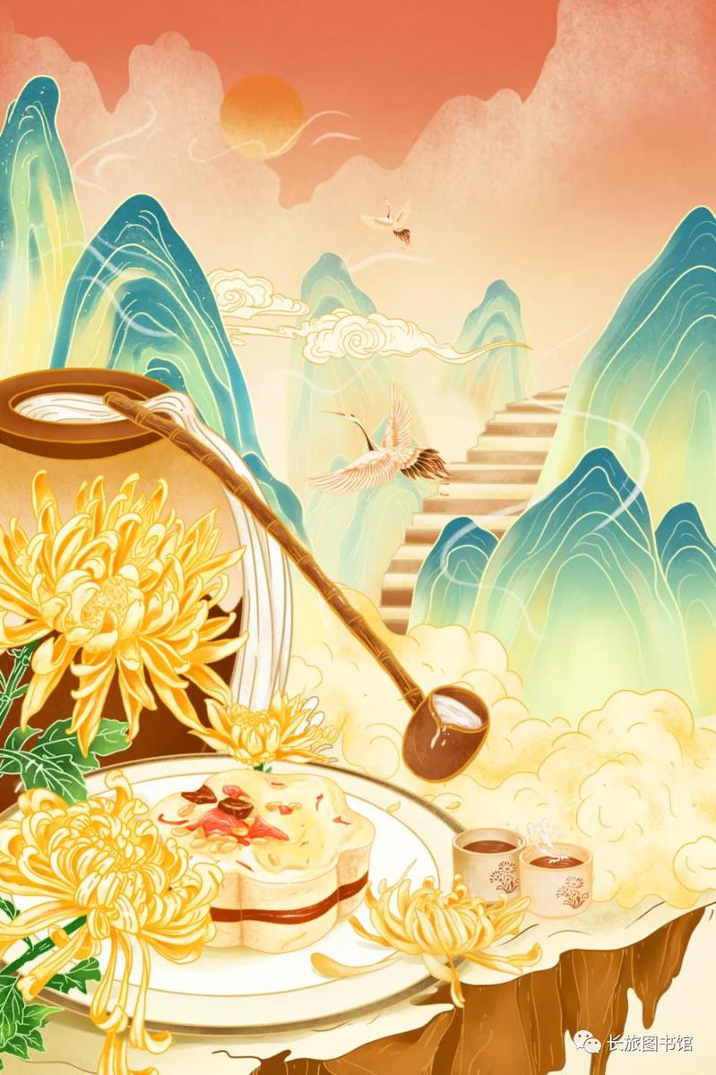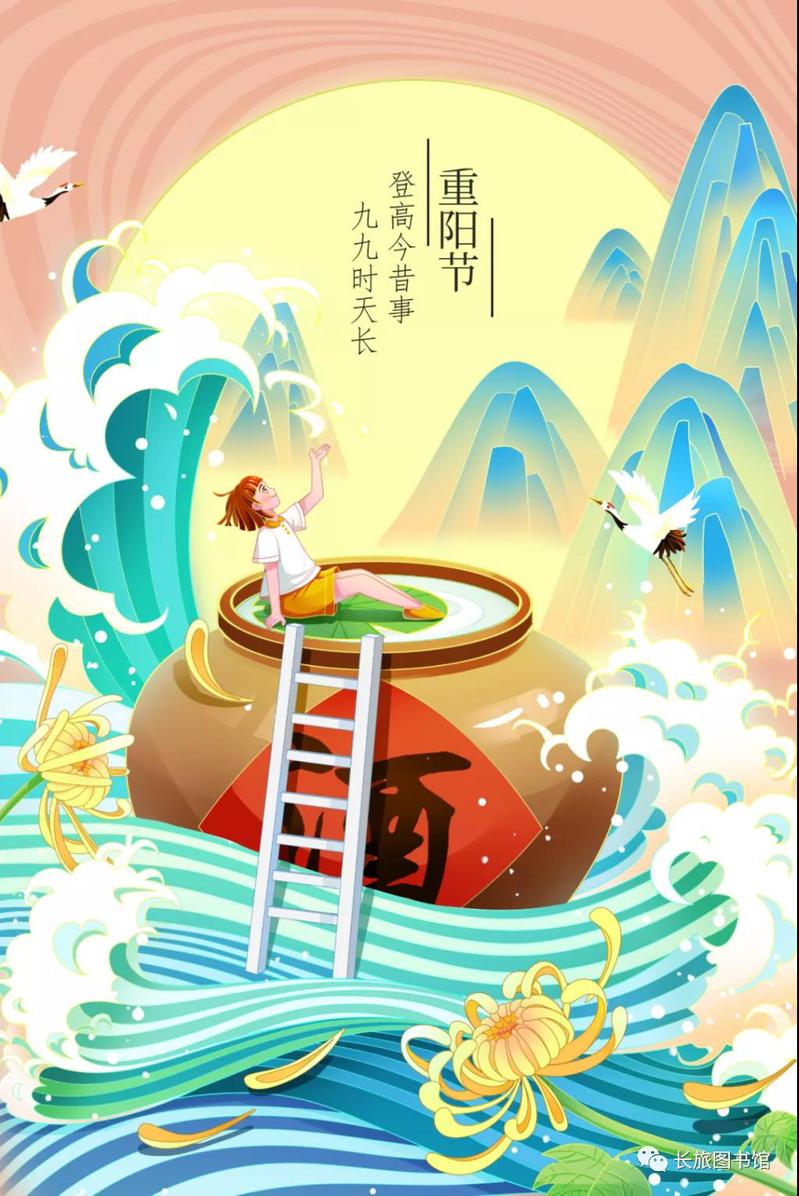农历九月初九是重阳节,庆祝重阳节一般会包括出游赏景、登高远眺、放纸鸢、观赏菊花、采中草药、摆敬老宴、吃重阳糕、制药酒养生、饮菊花酒等活动。上述插画中都有采用相关的元素来表达“重阳”这个主题,大家可以参考这种形式,依据某个传统节日、节气、典故的特色进行图像创作噢~