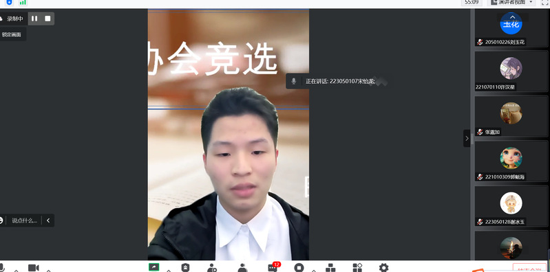 竞聘会上,竞聘者们按照会长、副会长、部长和部员的顺序依次发言,通过语言结合PPT的形式介绍着自己,包括个人的阅读爱好、优势、对图书馆的印象、对读书会的理解、对竞聘岗位的认知和未来的工作规划。大家犹如八仙过海,各显神通,纷纷展示了自己的优势以及想要竞选成功的决心。在这里,有“社牛”、“交际花”之称的路云鹏同学、有温婉才情的王涵同学、有发表过30余篇文章的娜丽同学、有文采斐然、热爱历史书籍的杨卓颢同学、有多次获奖,经验丰富的刘玉花同学、有积极主动的宋怡龙同学、有擅长PS、拥有经营公众号经验的金学荣同学……前来竞聘的每一位同学都各有所长,都有着多年的阅读习惯和深厚的文学功底。