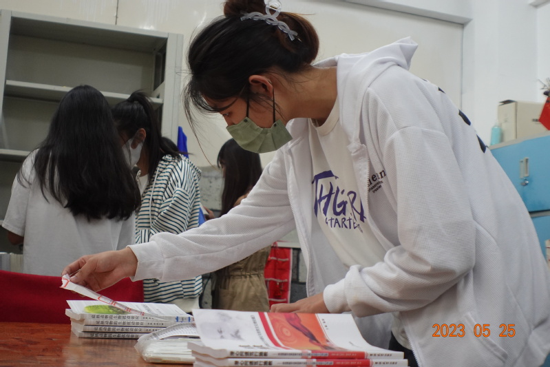 “老师,我可以试试吗?”“老师这个侧边章怎么盖上去的呀?”“老师,这个书标怎么贴能不贴串呀?”来到文献资源建设部伊始,同学们兴奋地提出了心中的各种小疑问。在马慧娟主任的热情介绍下,大家开始了解到了一本新书从到馆到上架前获得其“身份证号”的全过程。原来图书在进入流通前还需要进行夹磁条、粘贴条码、盖馆藏章、贴书标和书标覆膜这些物理加工流程以及数据加工流程,读者们也忍不住纷纷动手操作、体验一番。