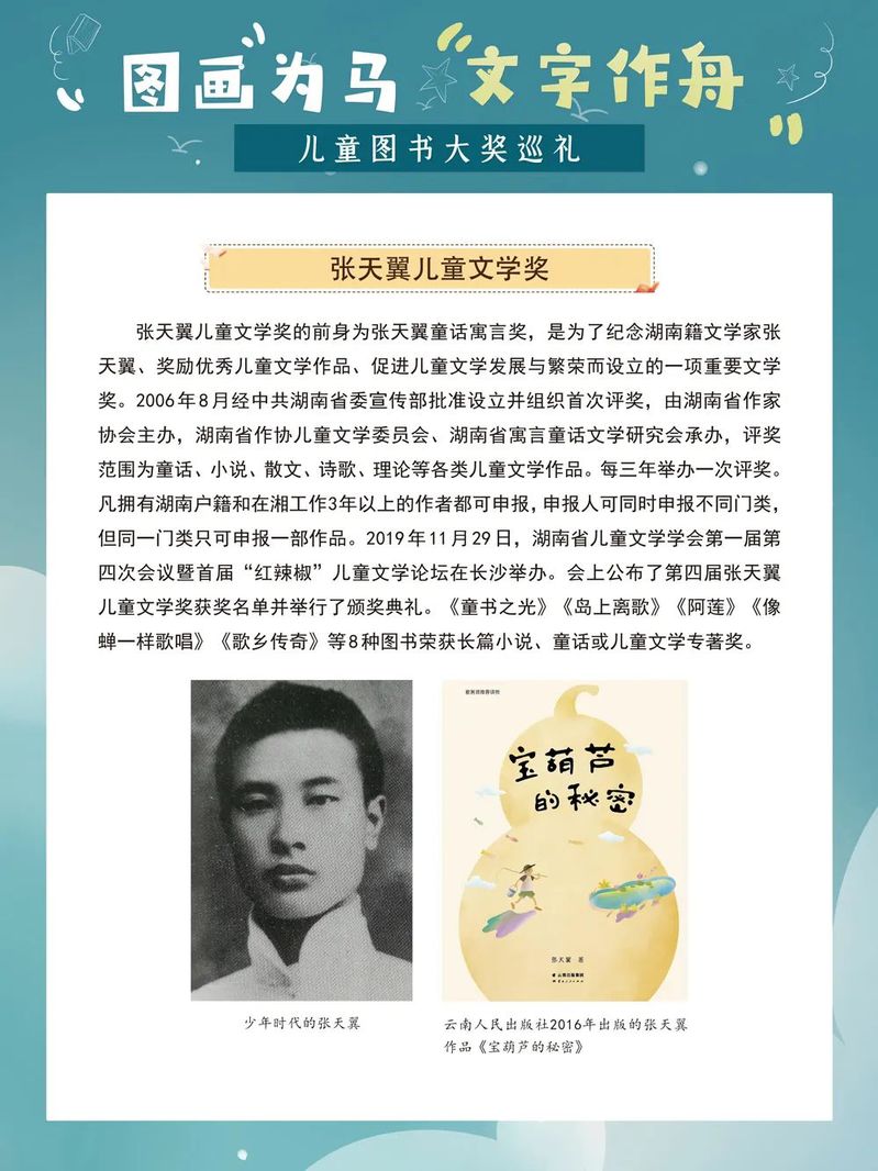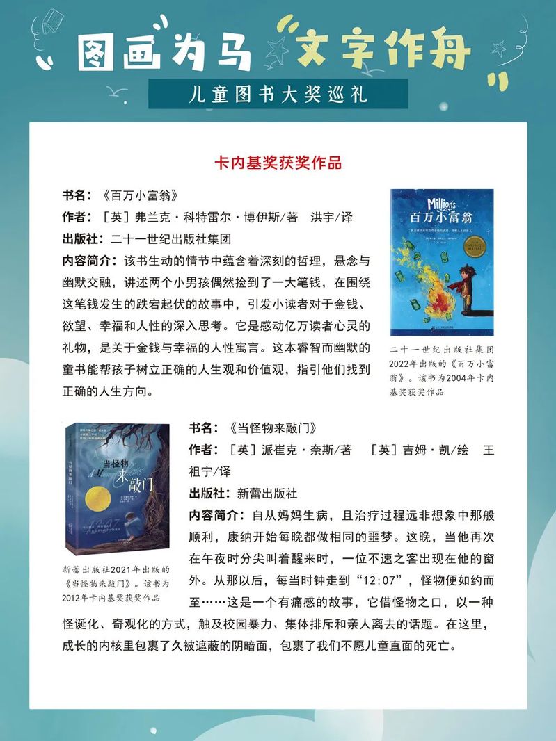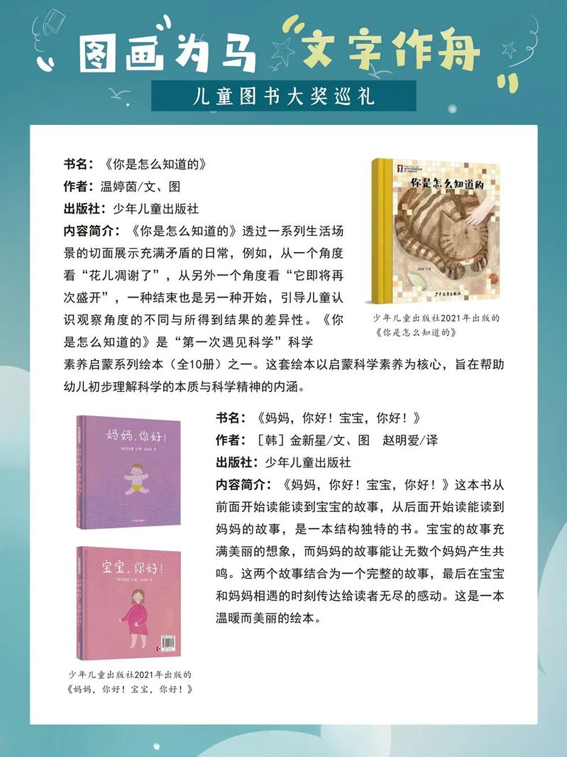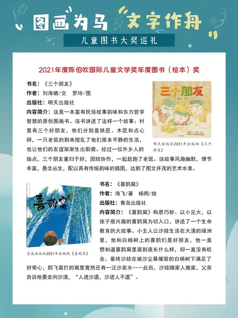 那些配有鲜亮图画的童书,为孩子们插上了想象的翅膀,给他们的童年留下了深刻的印记和无穷的欢乐。在童书的陪伴下,孩子们像一只只飞翔在蓝天中的鸟儿,无忧无虑、自由自在。而今,当我们成为父母,如何为我们的孩子挑选优秀而又适合的童书成为一个值得重视的问题。一年一度的“六一”国际儿童节如约而至,我们特别策划了这样一场儿童图书大奖展,为大家盘点国内外知名的儿童图书奖及部分获奖作品,为家长朋友们提供有益的参考,为小朋友们的童年增添缤纷的色彩。