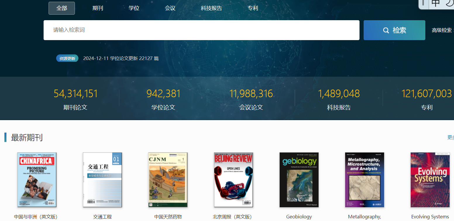 外文期刊:覆盖SCIE、SSCI、ESCI、AHCI、EI、Scopus等外文核心期刊,总量4.1万余本。