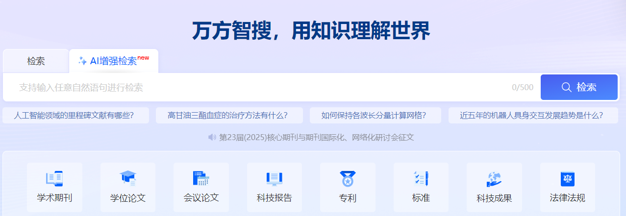 同时支持AI增强检索,万方数据AI增强检索深度融合大模型自然语言处理与深度语义理解能力,通过意图识别精准捕捉用户检索意图,简化复杂检索流程,让用户聚焦核心研究,高效获取高价值文献与知识洞察,为学术探索提供智能化支持。