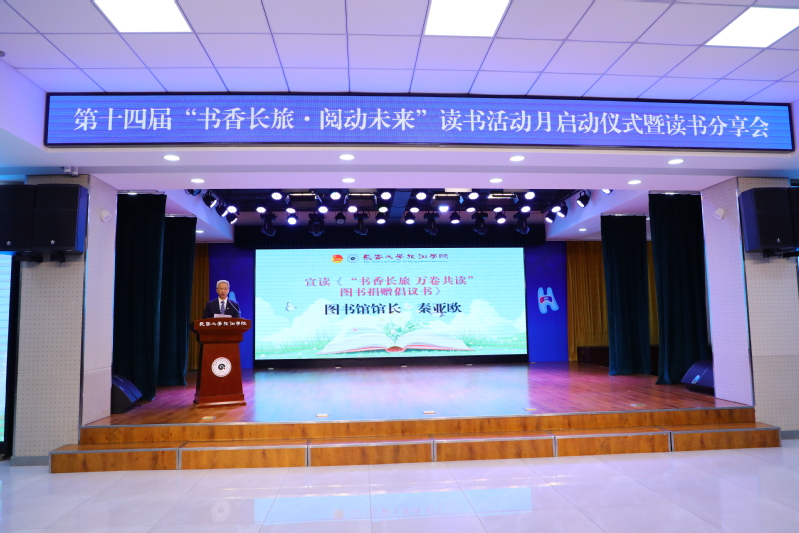 秦亚欧宣读《“书香长旅 万卷共读”图书捐赠倡议书》,他呼吁全体师生、校友积极响应倡议,踊跃捐赠闲置书籍。希望大家以实际行动践行公益精神,为打造书香四溢的长旅校园贡献力量,让知识的光芒照亮长旅学子的成长之路。