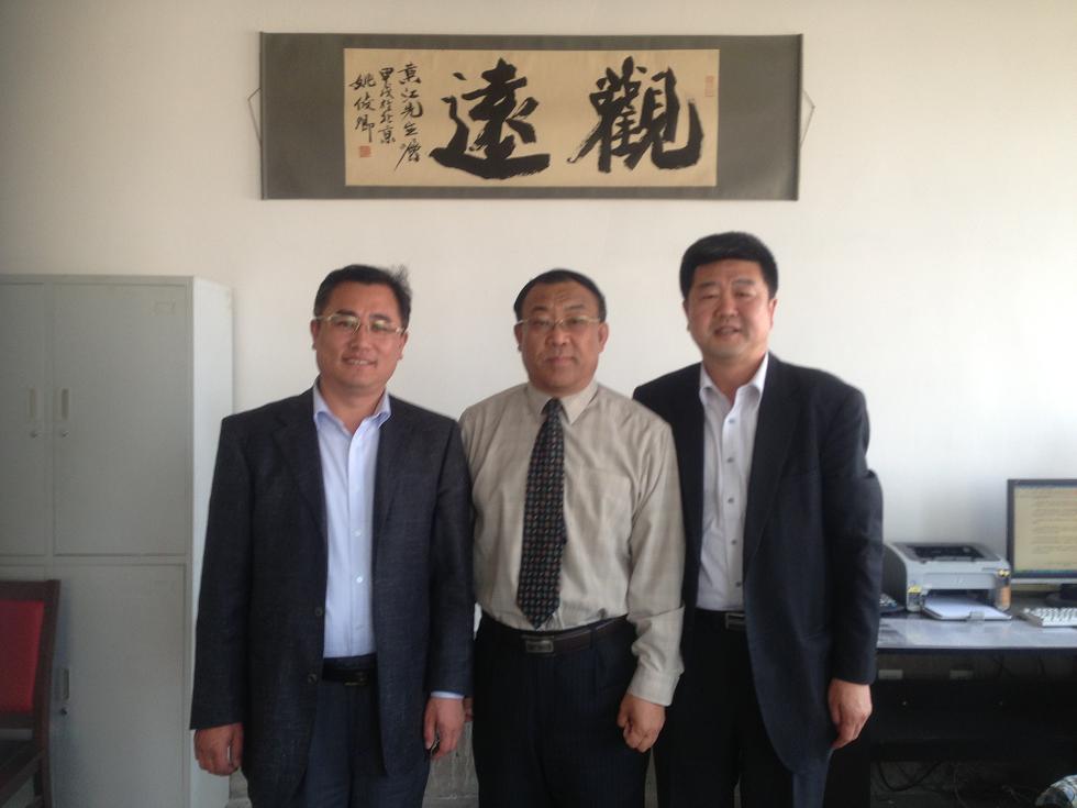 图1-1.郑杰部长(右一)、长春大学学工处处长王剑飞(左一)与外语分院和国际交流学院院长黄江合影