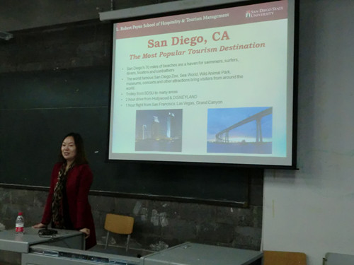 本次说明会由国际交流学院张俊梅老师主持,来自北京的国际创新教育联盟樊丽娜主任担任主讲,参加说明会的还有教育部教育发展战略培训中心主任张红军、旅游管理学院副院长李国茹、外国语学院、国际交流学院院长黄江、旅游管理学院院长助理周丽君及相关人员。樊丽娜主任向同学们详细讲解了美国圣地亚哥州立大学跨国学习与实习项目的项目优势、申请要求、教务安排、项目证书、实习安排和项目费用等内容,让学生全方位、多角度的对该项目有了直观的了解和认识。