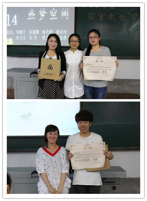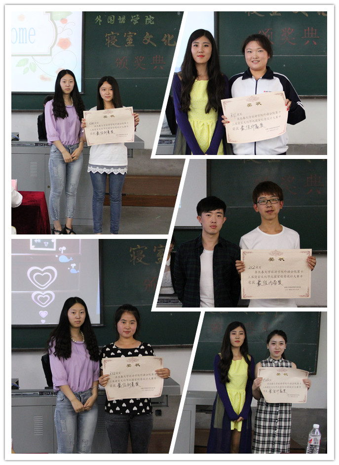外国语学院2013级寝室文化节历时一个学期,前后两次评比,是一次2013级全体参与的活动。本次颁奖典礼设优秀寝室一、二、三等奖及最佳印象、 最佳创意、 最佳内务、 最佳DIY四个单项奖。男生寝室208、女生寝室414分别凭借《星空》和《盗梦空间》独特的创意、精致的细节以及团结向上的氛围在本次比赛中荣获一等奖。