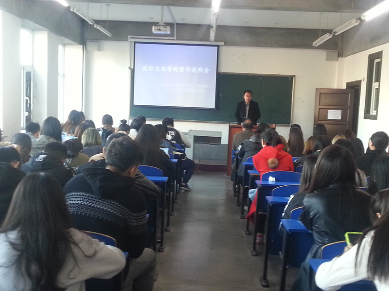 2016年10月11日下午,我院在教学楼222教室举办赴新西兰UUNZ学院留学宣讲会,来自新西兰UUNZ学院校方代表王旭老师专程来到我院开展项目宣讲,外国语学院及经济管理学院百余名学生到会参加。外国语学院、国际交流学院黄江院长、于刚副院长、招生就业处冷震洲处长等列席参加。