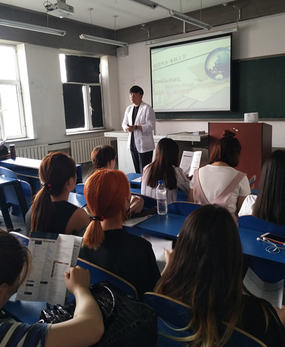 6月20日下午3点,我院在教学楼218教室举办赴韩国外国语大学留学说明会,韩国外国语大学语学研究所中国地域负责人张天罡老师专程从韩国赶赴我院进行宣讲,各学院各专业近百名学生慕名而来。