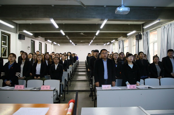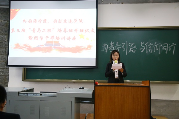 在雄伟庄严的国歌中开班仪式正式拉开帷幕,孙野书记宣读了《外国语学院、国际交流学院第三期“青马工程”培训班实施方案》,希望新一期学员统一思想、凝聚共识,以培训班为新的起点,严于律己,做好学生干部表率。团委秘书长于斯涵作为本期青马学员代表发言并郑重承诺,将珍惜机会,认真学习,用十九大精神和习近平新时代中国特色社会主义思想武装头脑,做忠实的青年马克思主义者。