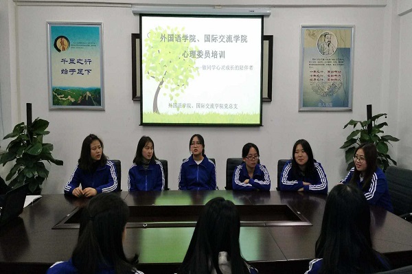 十九大报告指出,中国特色社会主义进入新时代。大学生作为祖国未来的接班人,“筑梦”精神必不可少。同时,祖国也需要大学生健康成长,成为未来的栋梁。为普及心理卫生知识,传播心理健康理念,提高学生干部应对心理危机事件的能力,2018年5月3日19:00,外国语学院、国际交流学院辅导员李姗、王旭两位老师组织2016级、2017级各班心理委员举办了主题为“做同学心灵成长的陪伴者”心理委员培训会。