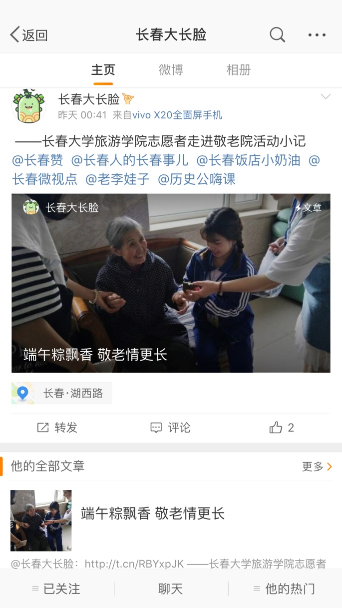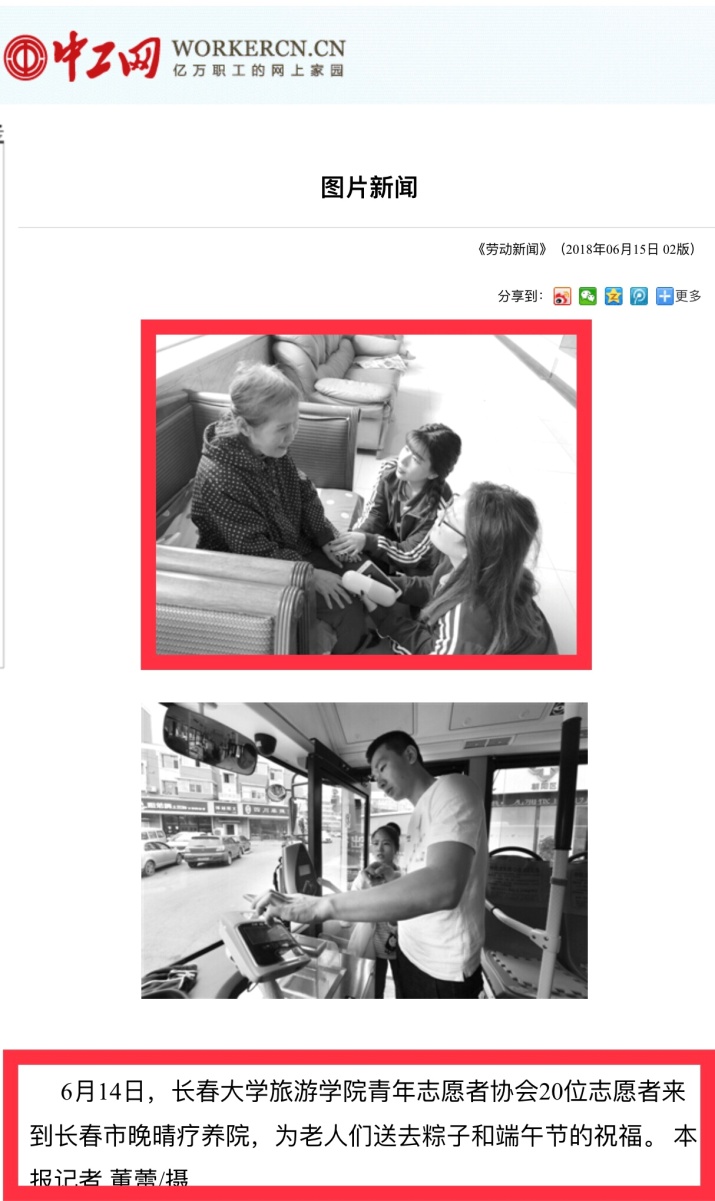 在端午节来临之际,金沙js9线路中心外国语学院、国际交流学院青年志愿者协会前往长春市晚晴疗养院,为老人们送去节日的问候。此次敬老活动得到中工网报道及多位新浪微博认证博主转载。