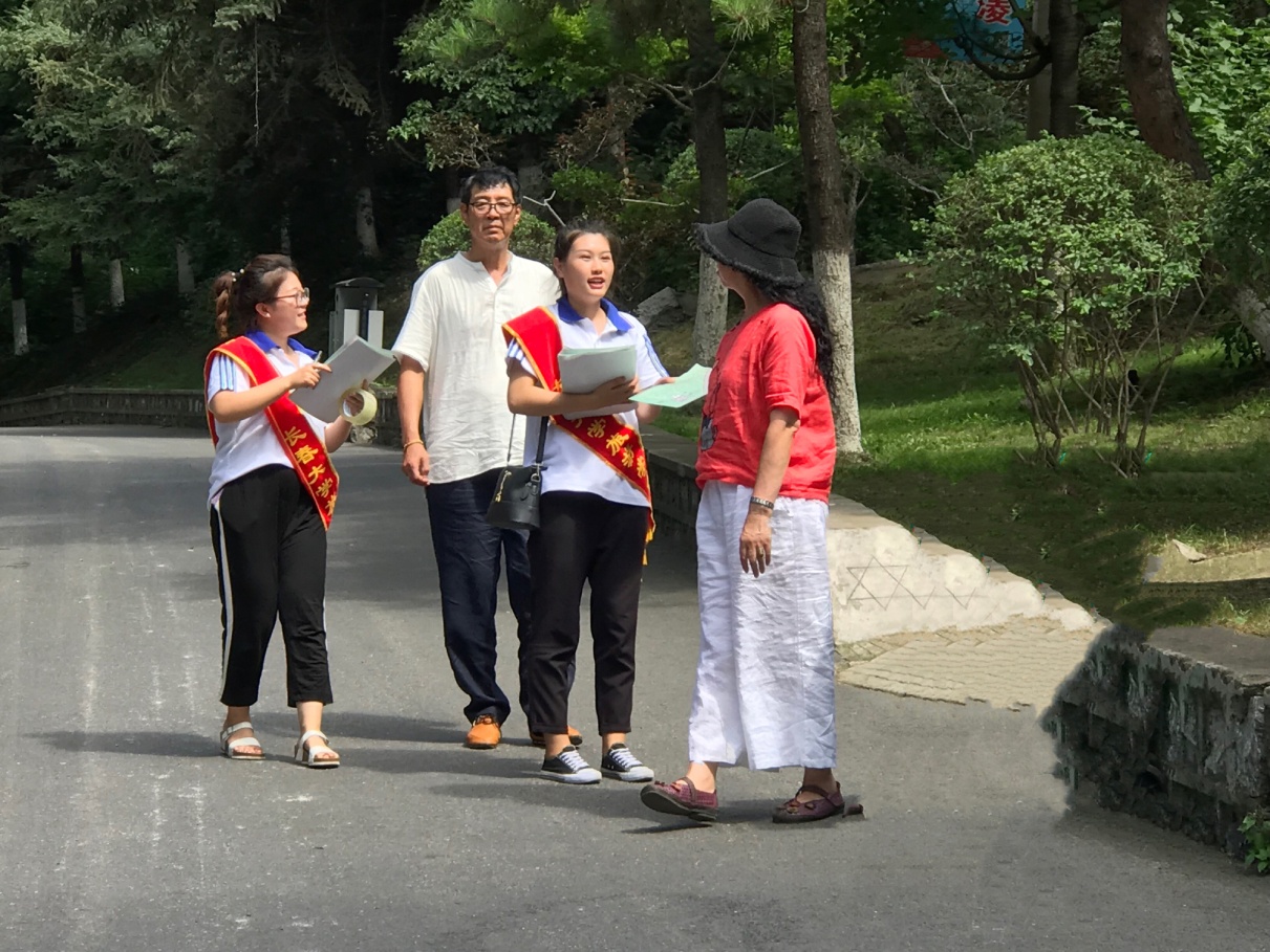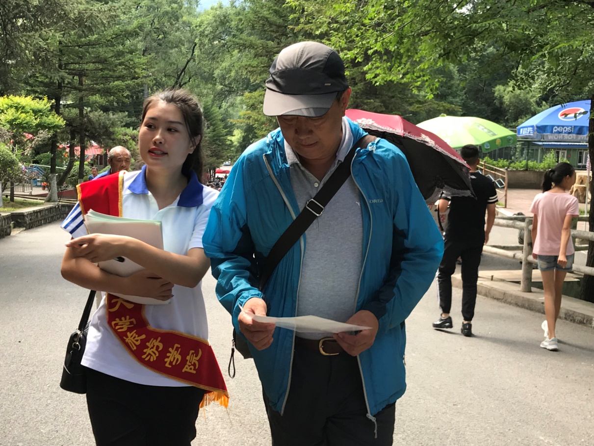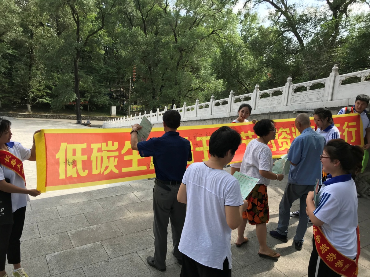 第二天,带着对革命先烈的无限崇敬和新时代的社会责任,实践团先后来到玉皇山公园和广电大厦彩虹桥,顶着烈日进行“低碳生活始于心 节约资源践于行”环保宣传及签名活动。向游人发放环保宣传单,讲解低碳环保知识,帮助大家提高环保意识,共建绿色家园。宣传倡议活动得到外地游客、通化市体育运动学校师生、65637部队军官和城市管理执法者等各界人士的积极响应和支持,几位通化本地的阿姨得知团队是从长春来的大学生,更赞许我们是优秀新一代并亲切叮嘱路途安全。活动中团队成员不惧酷暑、奉献社会的精神感动了通化市金科美厨房设备有限公司的工作人员,特意送来了矿泉水帮大家解暑降温。