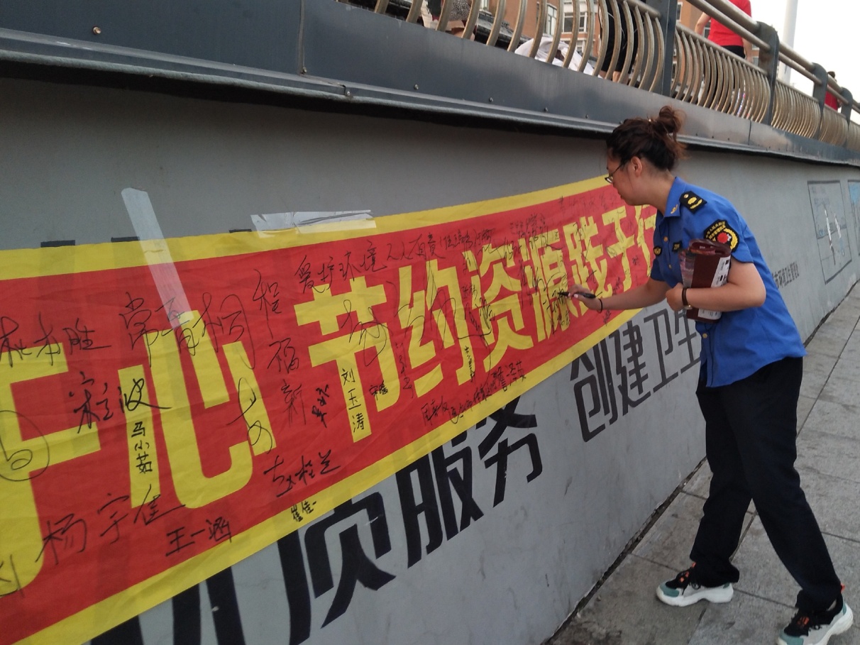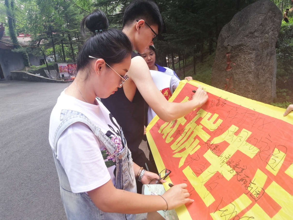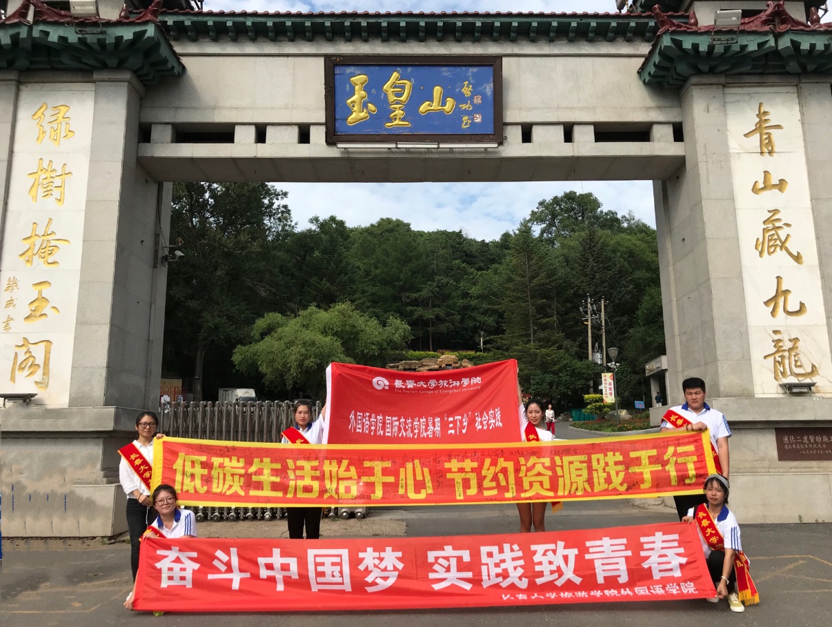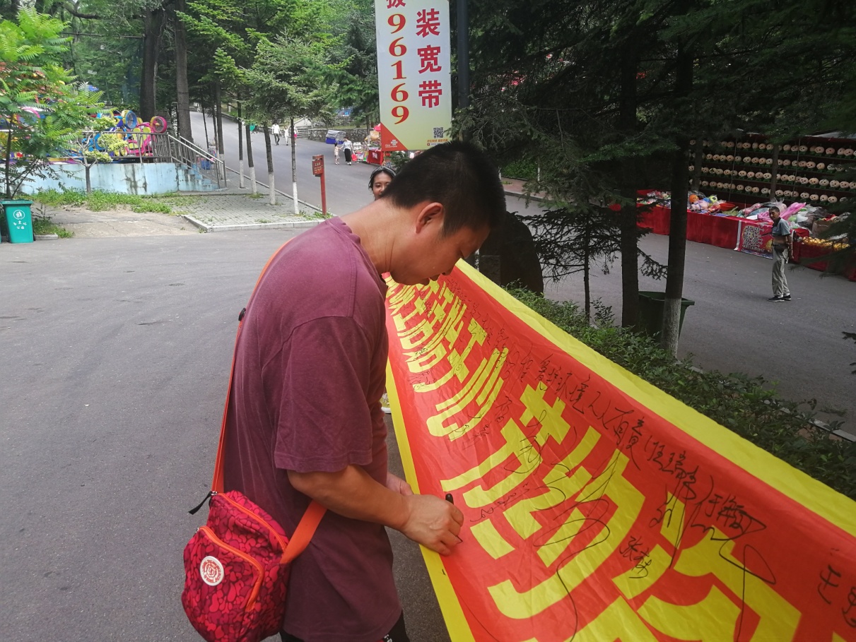 第二天,带着对革命先烈的无限崇敬和新时代的社会责任,实践团先后来到玉皇山公园和广电大厦彩虹桥,顶着烈日进行“低碳生活始于心 节约资源践于行”环保宣传及签名活动。向游人发放环保宣传单,讲解低碳环保知识,帮助大家提高环保意识,共建绿色家园。宣传倡议活动得到外地游客、通化市体育运动学校师生、65637部队军官和城市管理执法者等各界人士的积极响应和支持,几位通化本地的阿姨得知团队是从长春来的大学生,更赞许我们是优秀新一代并亲切叮嘱路途安全。活动中团队成员不惧酷暑、奉献社会的精神感动了通化市金科美厨房设备有限公司的工作人员,特意送来了矿泉水帮大家解暑降温。