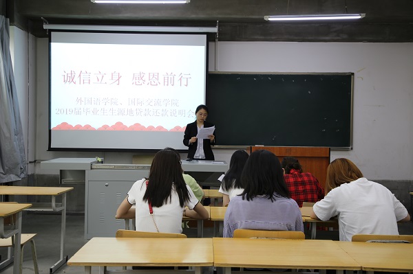 为让2019届毕业生更好的了解生源地贷款意义,履行还款义务,近日,外国语学院、国际交流学院召开了“诚信立身 感恩前行”2019届毕业生生源地贷款还款说明会,会议由2019届辅导员孙野主持,申请过生源地贷款的毕业生参加了说明会。