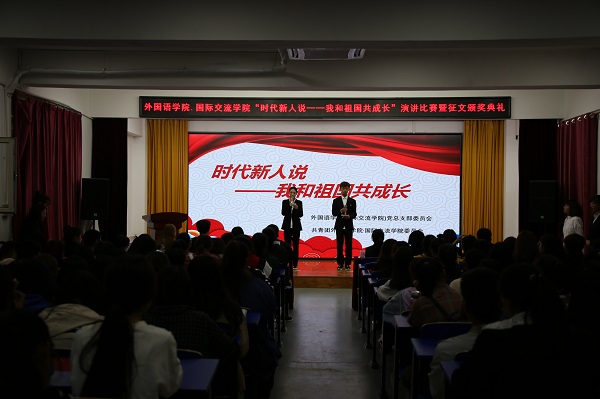 70年春风化雨,70年沧海巨变,70年砥砺奋进,70年众志成城,云变幻七十载,神州大地英豪出,扬青春游学海,雷东胸中万卷书,世唱响千秋业,蓄志共铸中国梦。为庆祝中华人民共和国成立70周年,大力唱响礼赞新中国、奋进新时代的青春主旋律,激励和引导广大团员青年大力弘扬以爱国主义为核心的伟大民族精神,9月29日,外国语学院、国际交流学院团委举办“时代新人说——我与祖国共成长”庆祝建国70周年演讲比赛决赛,外国语学院、国际交流学院党总支副书记孙野、团委书记戴军威、辅导员礼晓宇、高诗聪、刘思瑶、孙昊、陈秀琦、王梓豪等四名在省市级比赛中获奖的同学出席本次决赛,共同致敬建国七十周年!