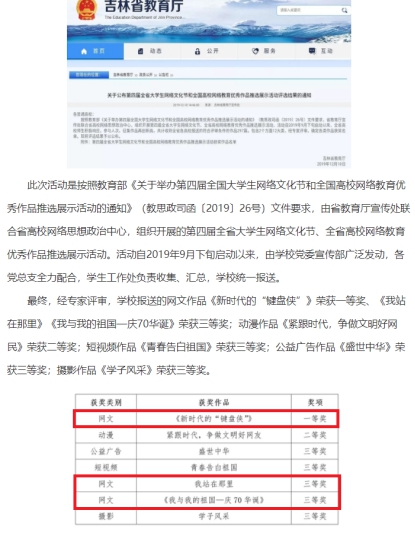 12月10日,吉林省教育厅公布《关于公布第四届全省大学生网络文化节和全国高校网络教育优秀作品推选展示活动评选结果的通知》,我院报送的网文作品《新时代的“键盘侠”》荣获一等奖、《我站在那里》《我与我的祖国—庆70华诞》荣获三等奖。
